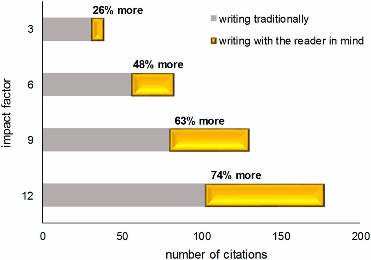 Image shows a stacked bar graph with number of citations on the x axis and impact factor on the y axis. At an impact factor of 3, writing with the reader in mind gives 26% more citations. At an impact factor of 12, writing with the reader in mind gives 76% more citations.